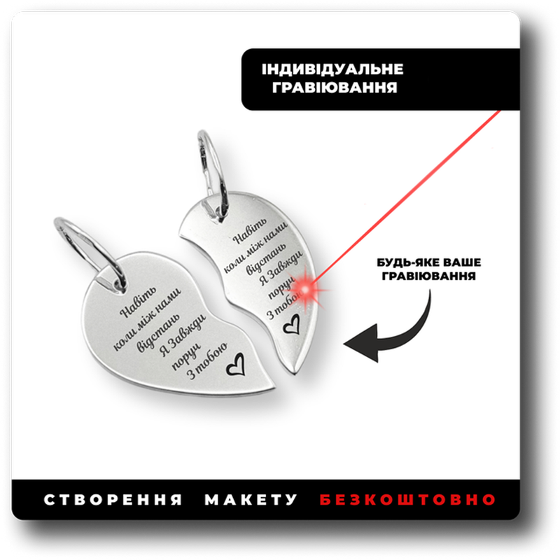 Замовити срібний кулон половинки серця з індивідуальним гравіюванням Ви можете у нашому магазині "GravityTAC - Індивідуальні подарунки з гравіюваювання та термодруком", додавши товар у кошик та формити замовлення з даними для відправки або зателефонувати за номером телефону 067 515 2566 (Вайбер)